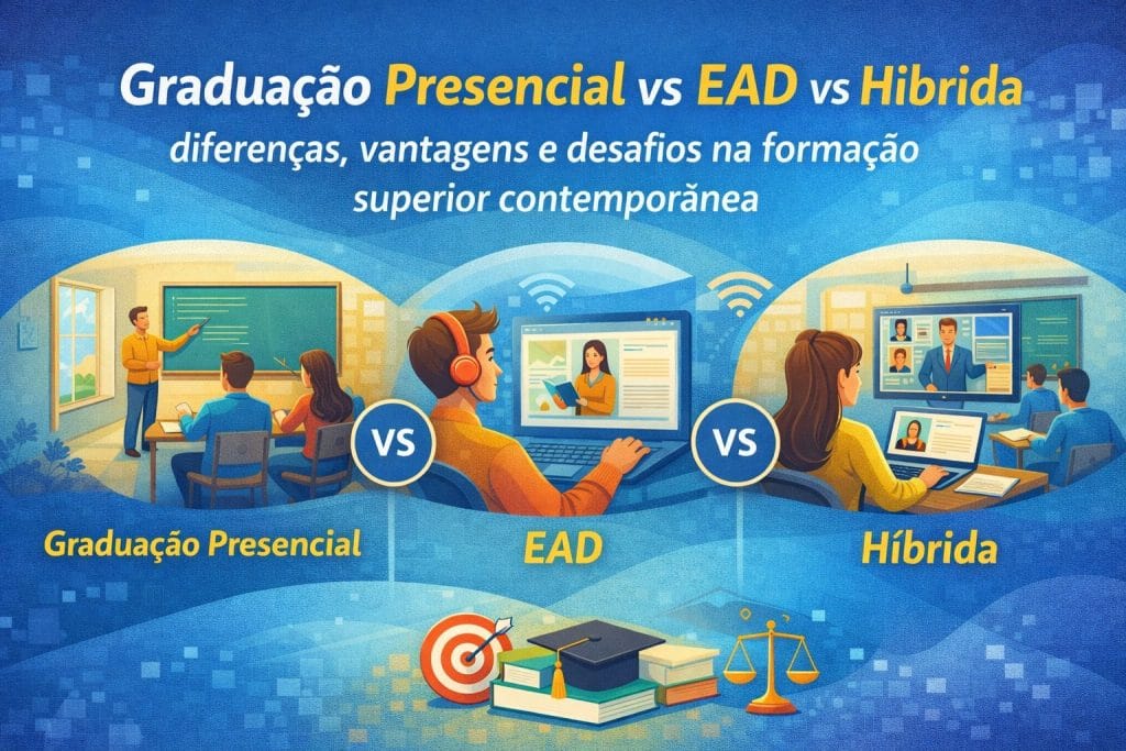 Enquanto o ensino presencial se destaca pela interação direta e vivência acadêmica, o EAD oferece flexibilidade, acessibilidade e autonomia. A graduação híbrida, por sua vez, integra o melhor dos dois mundos, consolidando-se como uma tendência no ensino superior.